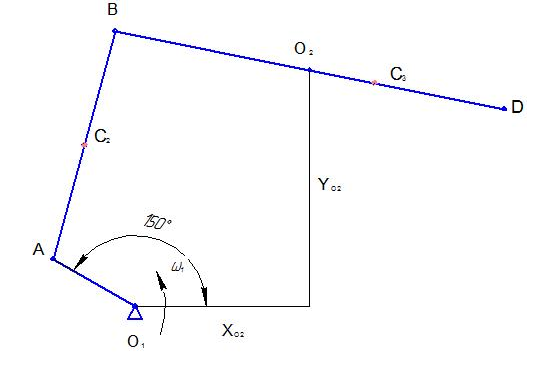 Определить скорости и ускорения точек А, В, С, D шарнирного четырёхугольника, а также угловые скорости ω2 шатуна АВ и ω3 коромысла ВD в положении, указанном на рис.1. Дано =О1А=1,0 м, =АВ=2,5 м, φ=150°,= ВО2=2,1 м, =О2D=2,1 м, = АC2=1,25 м,=О2С3=0,7 м, ω1= ωО1А=1 с-1=const . Координаты точки О2: XO2=1,847 м, YO2=2,5 м.