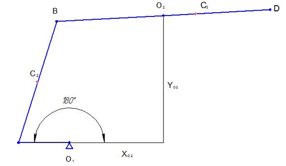 Определить скорости и ускорения точек А, В, С, D шарнирного четырёхугольника, а также угловые скорости ω2 шатуна АВ и ω3 коромысла ВD в положении, указанном на рис.1. Дано =О1А=1,2 м, =АВ=3,0 м, φ=180°,= ВО2=2,5 м, =О2D=3,5 м, = АC2=1,5 м,=О2С3=1,167 м, ω1= ωО1А=1 с-1=const . Координаты точки О2: XO2=2,193 м, YO2=3,0 м.