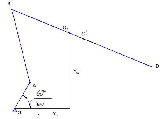 Определить скорости и ускорения точек А, В, С, D шарнирного четырёхугольника, а также угловые скорости ω2 шатуна АВ и ω3 коромысла ВD в положении, указанном на рис.1. Дано =О1А=1,2 м, =АВ=3,0 м, φ=60°,= ВО2=2,5 м, =О2D=3,5 м, = АC2=1,5 м,=О2С3=1,167 м, ω1= ωО1А=1 с-1=const . Координаты точки О2: XO2=2,193 м, YO2=3,0 м