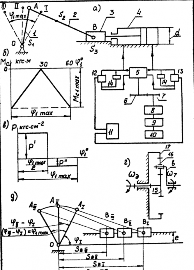 Рулевая машина (рис. 1а) предназначена для поворота руля летательного аппарата с целью изменения траектории его полета. Основным механизмом является коромысло-ползунный механизм OAB, на валу O которого закреплен руль летательного аппарата. Поворот руля (вместе со звеном 1) осуществляется с помощью шатуна 2 ведущим ползуном 3, с которым жестко связан поршень, перемещающийся в цилиндре 4.