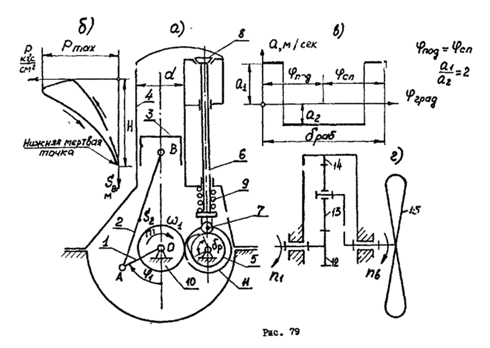 Основным механизмом двигателя является кривошипно-ползунный (рис. 79а), который состоит из кривошипа 1, шатуна 2 и поршня 3. Диаграмма изменения давления в цилиндре 4 двигателя (рис. 79б) строится по данным табл. 79-2. Рабочий цикл двухтактного двигателя осуществляется за один оборот кривошипа.