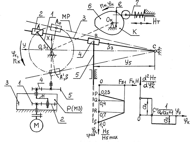 Кривошип I получает вращение от электродвигателя через редуктор. Через камень 2 движение передается кулисе 3, которая совершает карательное движение относительно оси. Далее посредством звена 4 пуансон 5 получает возвратно-посту- пательное движение и при рабочем ходе сверху вниз прошивает отверстие.