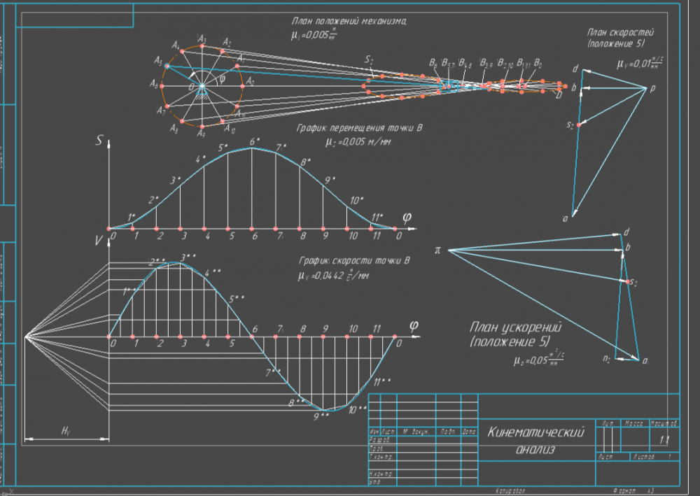 -Кинематический анализ: Построение 12 планов положений механизма за один цикл. Построение диаграммы перемещения и диаграммы скорости выходного звена (метод хорд). Расчет скоростей и ускорений точек и звеньев в заданном положении (7-е положение) методом планов скоростей и ускорений.