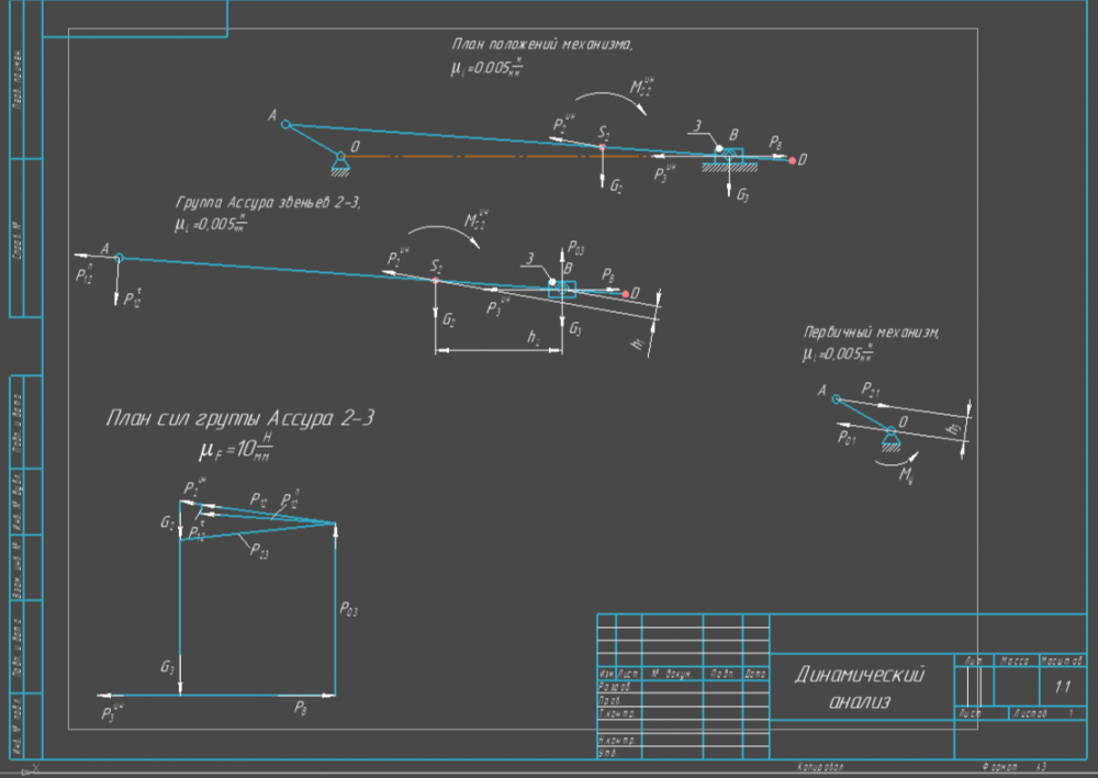 -Динамический (кинетостатический) анализ: Определение сил инерции, сил тяжести и моментов сил инерции. Построение плана сил для группы Ассура (звенья 2-3). Определение реакций в кинематических парах и уравновешивающего момента на кривошипе.