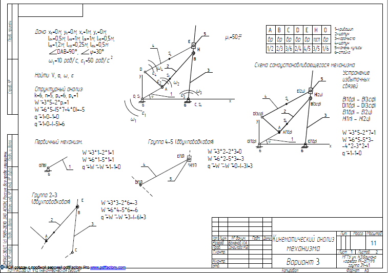 Для студентов МГТУ им. Н.Э.Баумана по предмету Теория механизмов и машин (ТММ)Структурный + Кинематический анализ рычажного механизмаСтруктурный + Кинематический анализ рычажного механизма