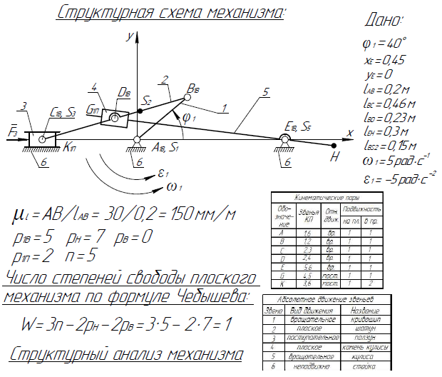 ДЗ: ДЗ (φ = 40°) (Структурный анализ, кинематический анализ, силовой расчёт) вариант 1