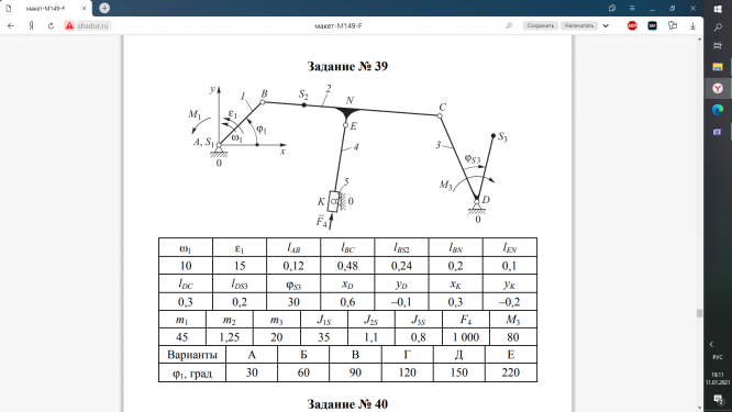 ДЗ: Силовой и кинематический анализы. Маткад вариант 39