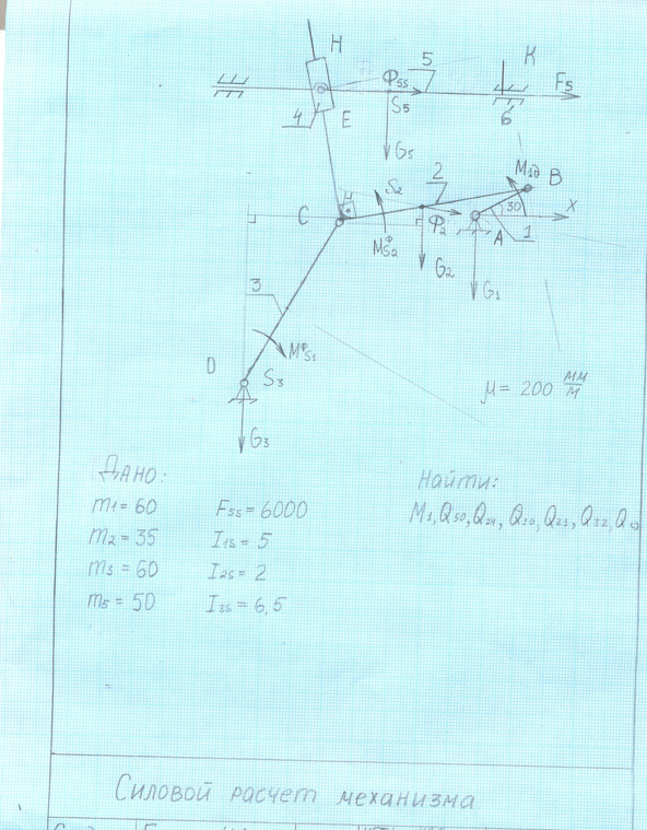 Для студентов МГТУ им. Н.Э.Баумана по предмету Теория механизмов и машин (ТММ)ДЗ Силовой расчет, Вариант 7Д (Угол 30)ДЗ Силовой расчет, Вариант 7Д (Угол 30)