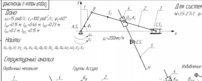 Структурная схема механизма, Кинематическая схема механизма, Расчеты определения скоростей, Расчеты определения ускорений. полностью зачтенная работа
