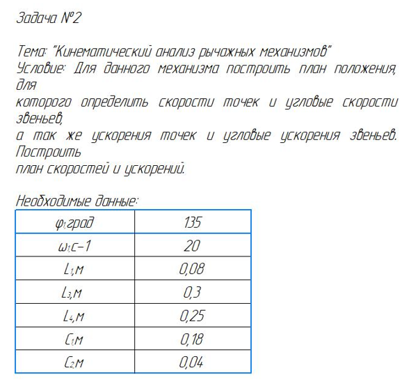 Для данного механизма построить план положения, для которого определить скорости точек и угловые скорости звеньев, а так же ускорения точек и угловые ускорения звеньев