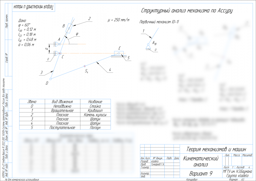 Для студентов МГТУ им. Н.Э.Баумана по предмету Теория механизмов и машин (ТММ)Структурный анализ + Кинематический анализСтруктурный анализ + Кинематический анализ