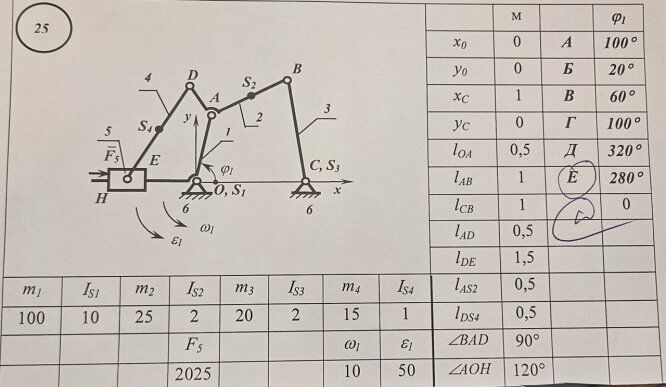 ДЗ 1: Структурный, кинематический и силовой анализ механизма. Вариант 25 Начальный угол 280 градусов. вариант 25