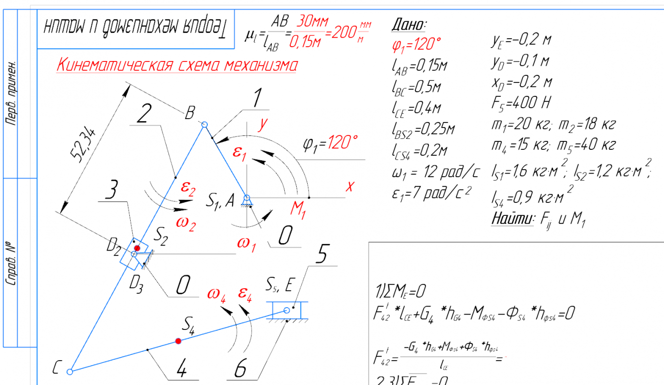 👉ДЗ №1 + №2: Структурный + Кинематический анализ и Силовой анализ рычажного механизма (Вариант 19Б)