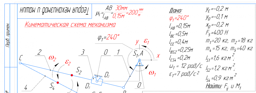 Главная » Учебные материалы » Теория механизмов и машин (ТММ) » Домашние задания » МГТУ им. Н.Э.Баумана » 4 семестр » Номер 1 » Вариант 19 » Структурный + Кинематический анализ и Силовой анализ рычажного механизма (КОМПАС 3D - Угол фи=240 град)