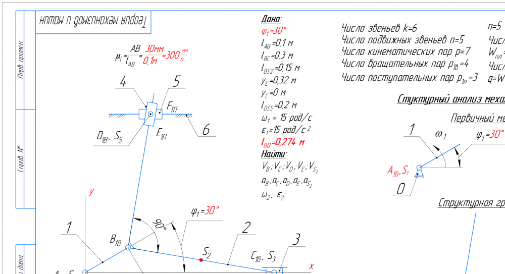 👉ДЗ №1: Структурный + Кинематический анализ рычажного механизма (Вариант 4Д)