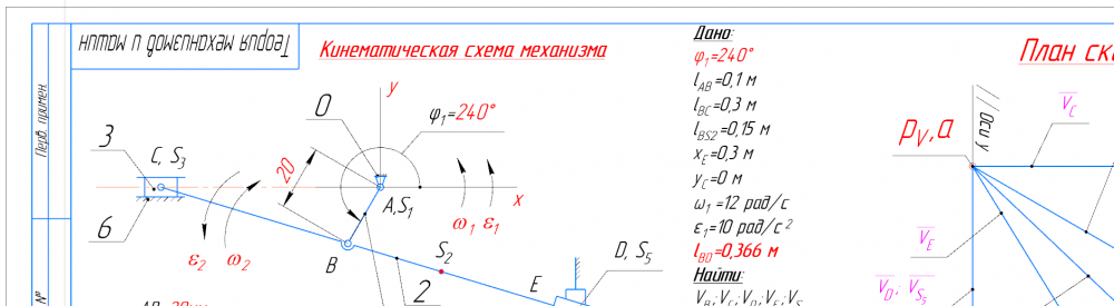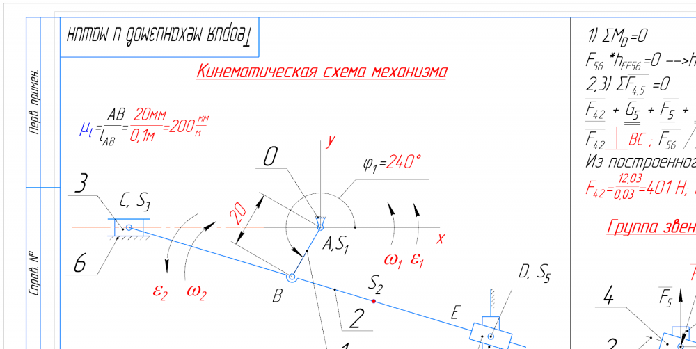 Главная » Учебные материалы » Теория механизмов и машин (ТММ) » Домашние задания » МГТУ им. Н.Э.Баумана » 4 семестр » Номер 1 » Вариант 3 » Структурный + Кинематический анализ и Силовой анализ рычажного механизма (КОМПАС 3D - Угол фи=240 град)