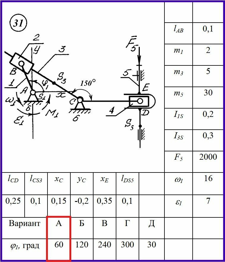 👉ДЗ №1 + №2: Структурный + Кинематический анализ и Силовой анализ рычажного механизма (Вариант 31А)