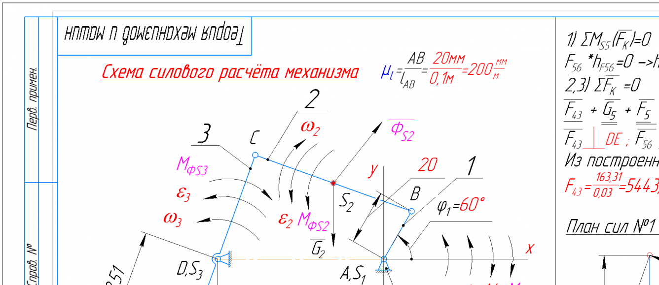 Структурный + Кинематический анализ и Силовой анализ рычажного механизма (КОМПАС 3D - Угол фи=60 град).