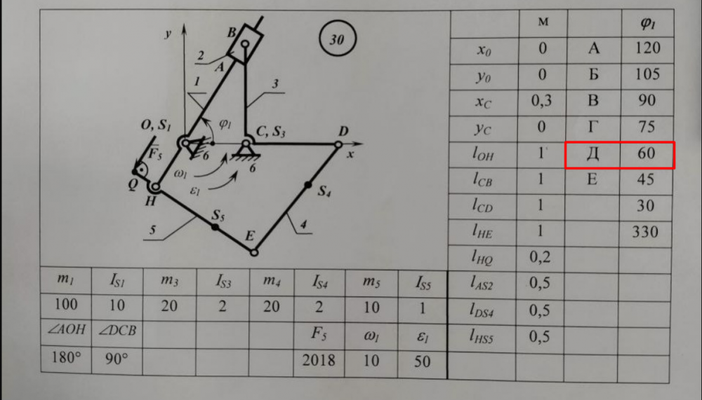 ДЗ 2: ДЗ 2: Силовой анализ рычажного механизма (КОМПАС 3D - Угол фи=60 град) вариант 30