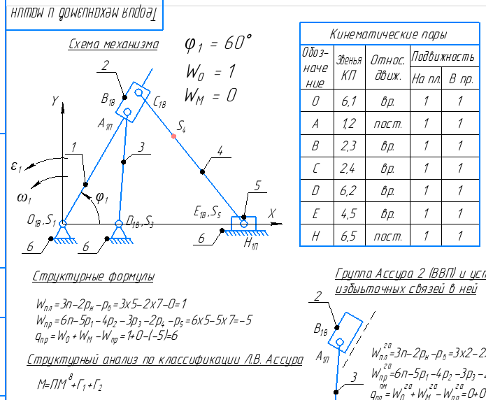 ДЗ 1: Структурный + Кинематический анализ рычажного механизма (КОМПАС 3D - Угол фи=60 град) вариант 34