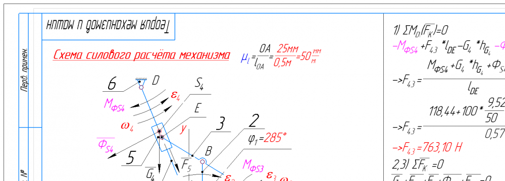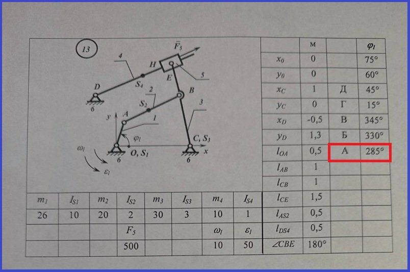 👉ДЗ №2: Силовой анализ рычажного механизма (Вариант 13А-Фи=285 град)