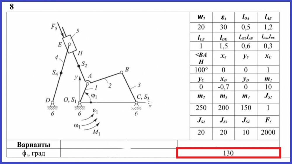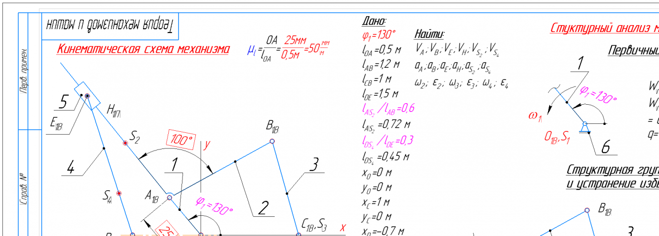 👉ДЗ №1 + №2: Структурный + Кинематический анализ и Силовой анализ рычажного механизма (Вариант 8-Угол фи=130 град)