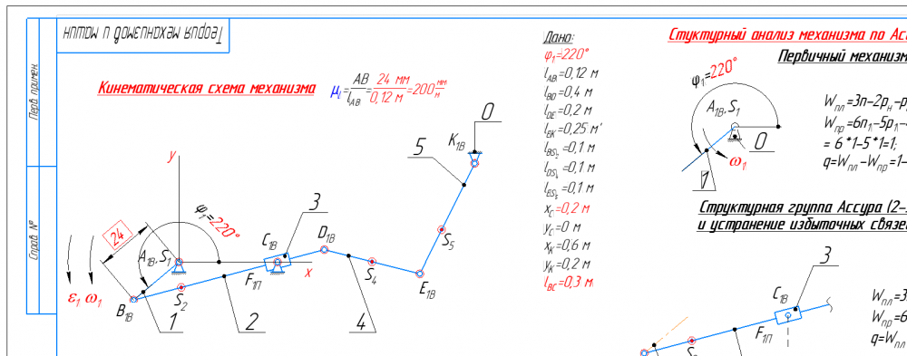 Главная » Учебные материалы » Теория механизмов и машин (ТММ) » Домашние задания » МГТУ им. Н.Э.Баумана » 4 семестр » Номер 1 » Вариант 43 » Структурный + Кинематический анализ и Силовой анализ рычажного механизма (КОМПАС 3D - Угол фи=220 град)
