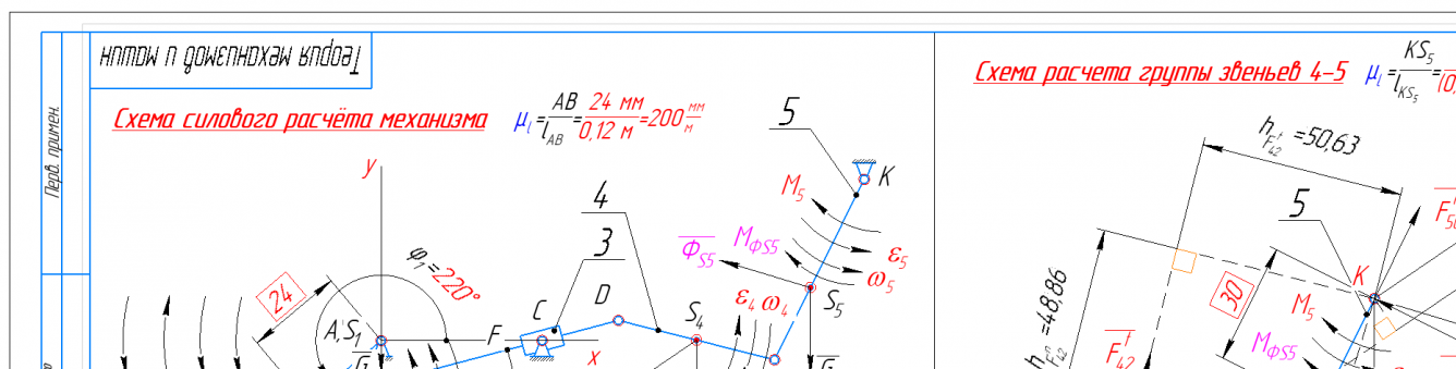 👉ДЗ №1 + №2: Структурный + Кинематический анализ и Силовой анализ рычажного механизма (Вариант 43Е-Фи=220)