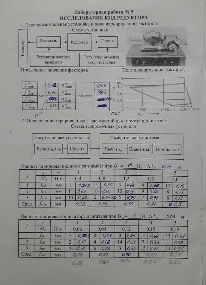 Рассмотрена схема редуктора. Определены тарировочные зависимости для двигателя и тормоза. На основе этих данных проведено экспериментальное определение зависимости КПД от момента сопротивления и ее графическое построение.