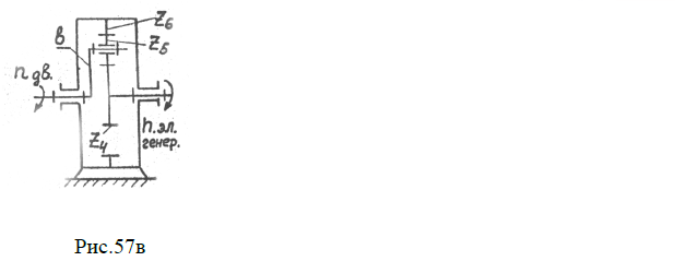 Коленчатый вал двигателя через планетарный повышающий редуктор (мультипликатор) приводит во вращение вал электрогенератора. (Электрогенератор и редуктор на схеме 57а не показаны.)