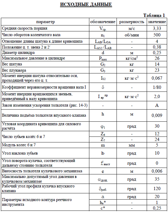 меньше числа оборотов коленчатого вала. Толкатели роликовые, поступательно движущиеся, с внеосностью e. Исходные данные приведены в таблице 1. Изменение давления газа на поршень в процессе его движения представлено индикаторной диаграммой, данные для построения которой представлены в пункте 1.2.