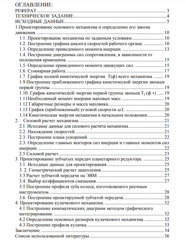 В пояснительной записке приведено проектирование основного механизма установки и укладки арматурной проволоки на конвейер, определение закона движения звена приведения, расчёт дополнительной маховой массы, силовой расчёт рычажного механизма, проектирование цилиндрической эвольвентной зубчатой передачи, проектирование двухрядного планетарного механизма, проектирование кулачкового механизма с поступательно двигающимся толкателем.