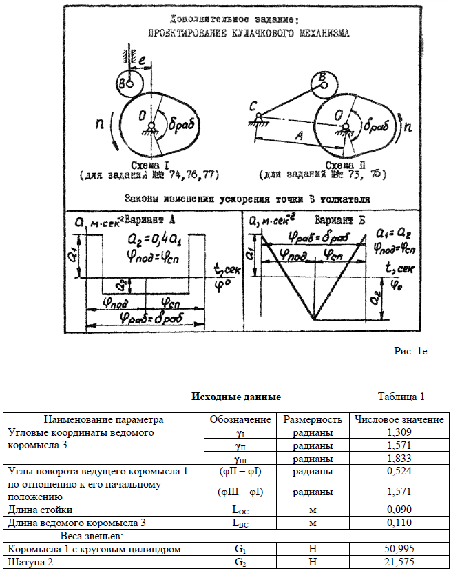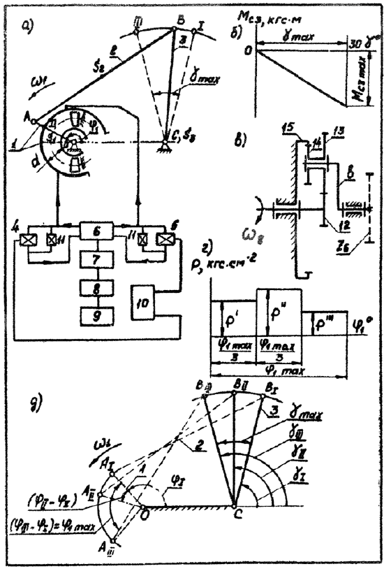 При повороте руля летательного аппарата (звено 3) из одного крайнего положения (I) в другое (III) (рис. 1а) на угол γmax на звено 3 действует момент сопротивления Мс3, зависимость которого от угла поворота γ представлена диаграммой (рис. 1б). Движущая сила, равная результирующей силе давления масла в круговом цилиндре, приложена в точке D звена ОА (LOD = ½ LOA). Результирующее давление в цилиндре 1 меняется по закону, изображённому на рис. 1г. Останов звена 3 в конечном положении должен происходить без удара (ω3кон = 0).