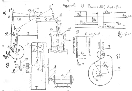 Примечания: 1. Шестизвенный механизм проектируется по заданным коэффициенту изменения скорости штока 13, углам размаха и , длинам звеньев , и размерам a и b.