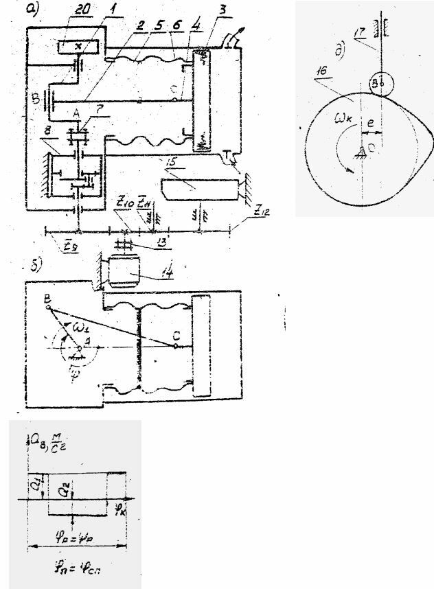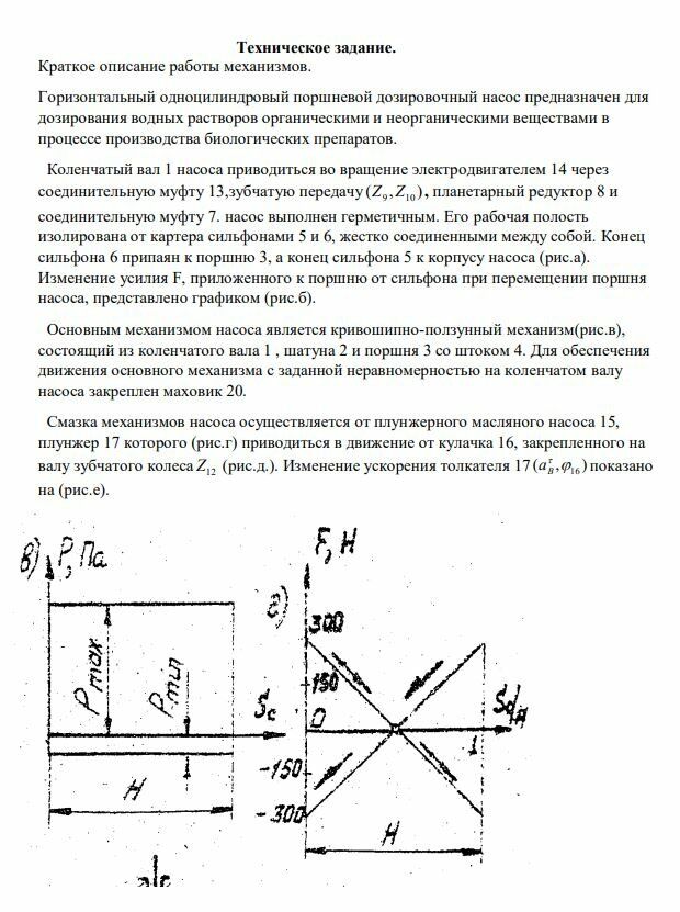 Краткое описание работы механизмов. Горизонтальный одноцилиндровый поршневой дозировочный насос предназначен для дозирования водных растворов органическими и неорганическими веществами в процессе производства биологических препаратов. Коленчатый вал 1 насоса приводиться во вращение электродвигателем 14 через соединительную муфту 13,зубчатую передачу ( , ) Z9 Z10 , планетарный редуктор 8 и соединительную муфту 7. насос выполнен герметичным. Его рабочая полость изолирована от картера сильфонами 5 и 6, жестко соединенными между собой. Конец сильфона 6 припаян к поршню 3, а конец сильфона 5 к корпусу насоса (рис.а). Изменение усилия F, приложенного к поршню от сильфона при перемещении поршня насоса, представлено графиком (рис.б). Основным механизмом насоса является кривошипно-ползунный механизм(рис.в), состоящий из коленчатого вала 1 , шатуна 2 и поршня 3 со штоком 4. Для обеспечения движения основного механизма с заданной неравномерностью на коленчатом валу насоса закреплен маховик 20. Смазка механизмов насоса осуществляется от плунжерного масляного насоса 15, плунжер 17 которого (рис.г) приводиться в движение от кулачка 16, закрепленного на валу зубчатого колеса Z12 (рис.д.). Изменение ускорения толкателя 17 ( , ) 16 aB показано на (рис.е).