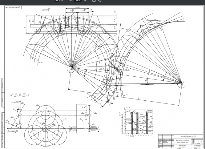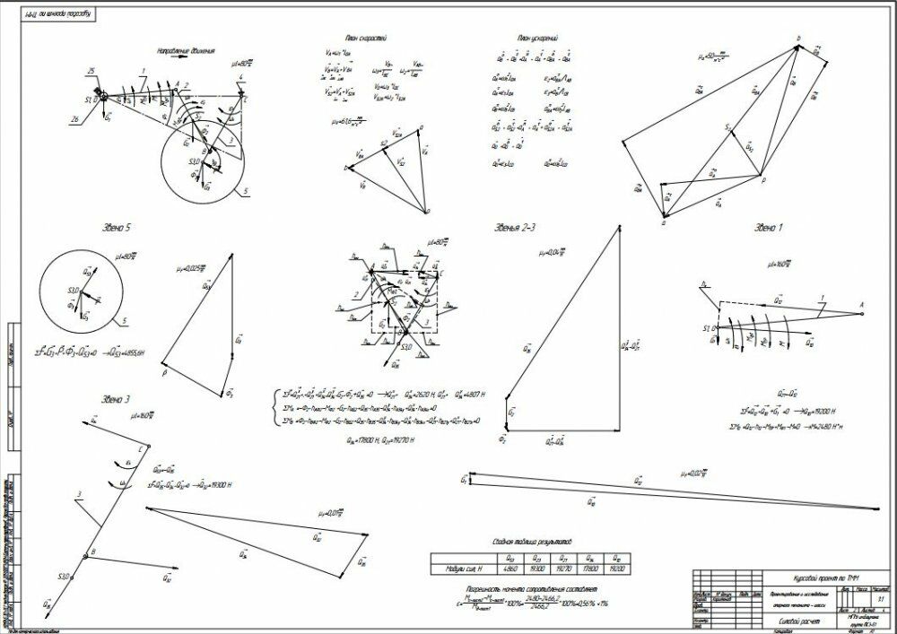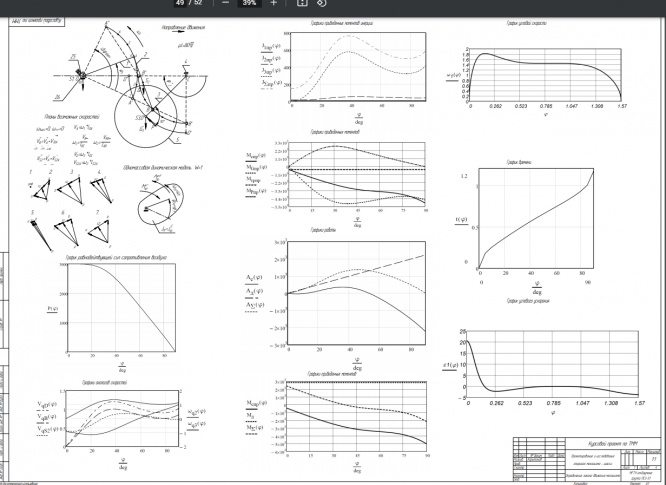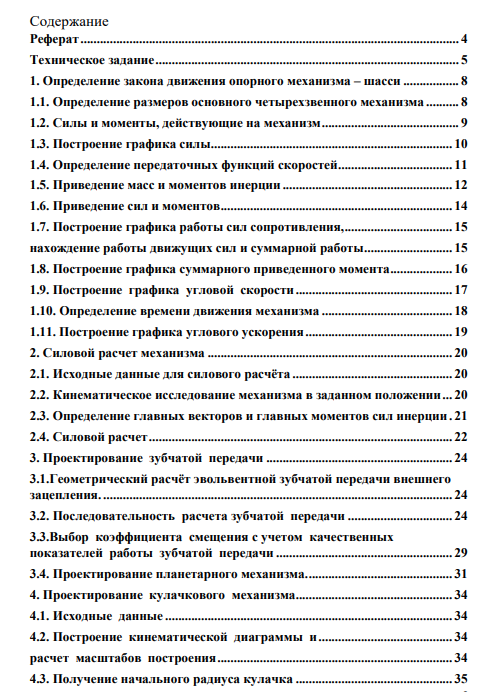 Курсовой проект состоит из расчетно-пояснительной записки – 37 листов машинописного текста, 4 листов формата А1 и дополнения в виде файла программы Mathcad 15 Raschet.xmcd. Расчетно-пояснительная записка содержит динамический расчет механической системы шасси. Расчет включает определение закона движения основного четырехзвенного механизма в режиме пуска - останова, силовой расчет основного механизма в заданном положении, расчет и исследование эвольвентной прямозубой зубчатой передачи и планетарного двухрядного редуктора с одним внешним и одним внутренним зацеплением, расчет центрального кулачкового механизма с поступательно движущимся роликовым толкателем.