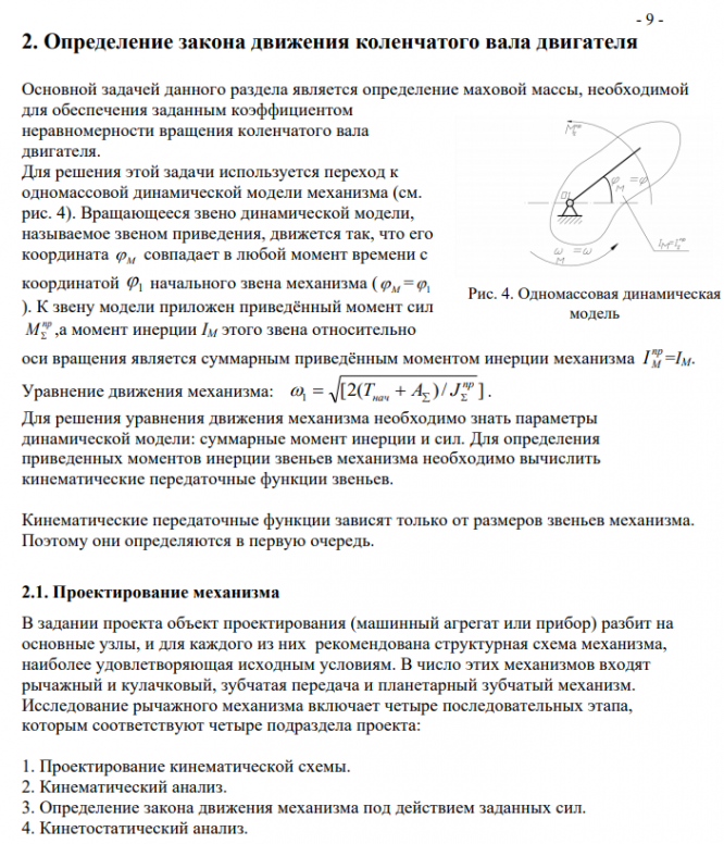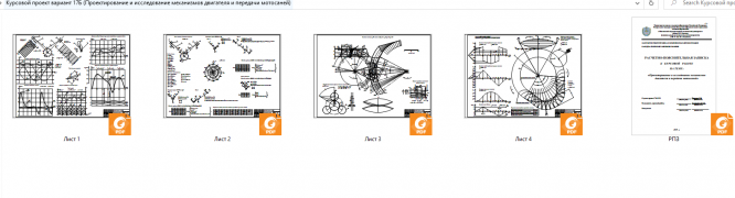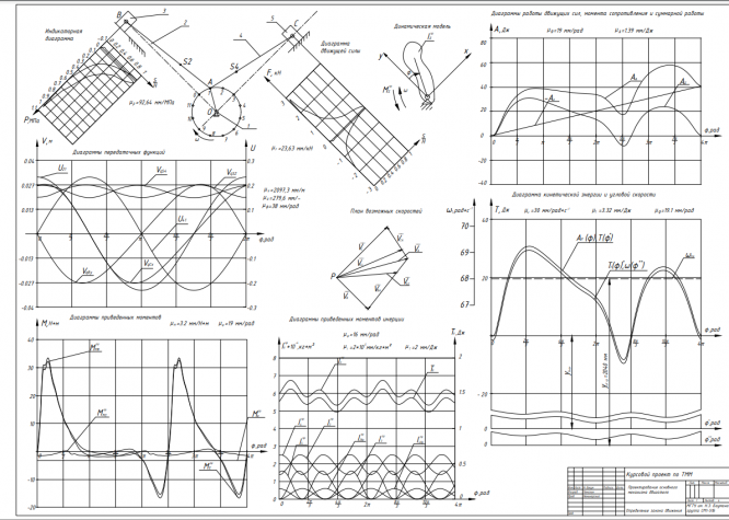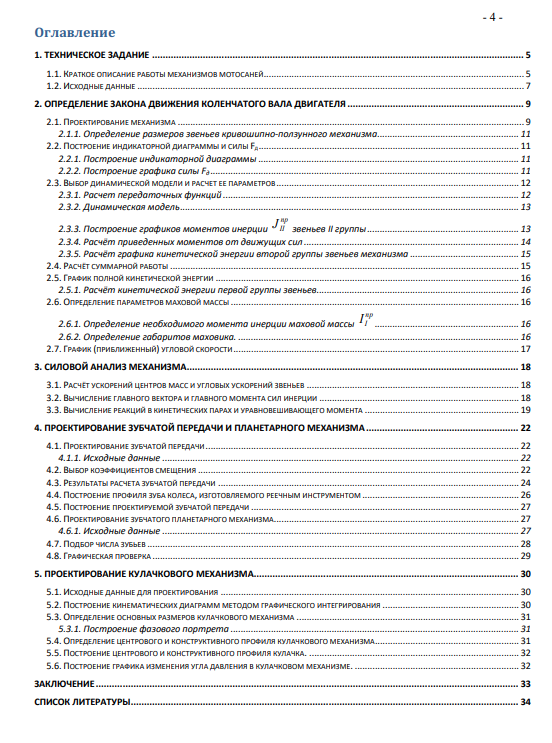 Курсовой проект содержит 4 листа формата А1 и расчетно-пояснительную записку в размере 34-х листов машинописного текста формата А4. В расчётно-пояснительной записке проведено: определение закона движения коленчатого вала двухцилиндрового, четырёхтактного, V-образного двигателя внутреннего сгорания, расчёт дополнительной маховой массы при заданном коэффициенте неравномерности; проведён силовой анализ кривошипно-ползунного механизма; проектирование цилиндрической эвольвентной зубчатой передачи и планетарного двухрядного механизма с двумя внешними зацеплениями; проектирование кулачкового механизма с поступательно движущимся толкателем.