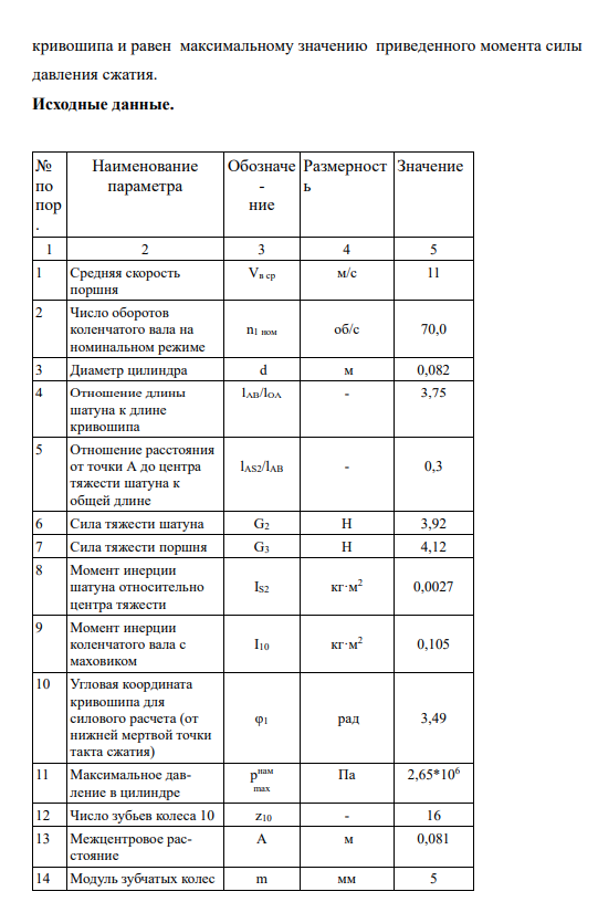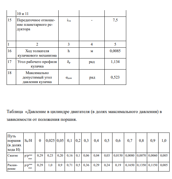 Механизмы движения мотороллера объединяют одноцилиндровый двухтактный двигатель внутреннего сгорания и вспомогательные устройства: механизм газораспределения и механизм привода вентилятора (рис.79). Основным механизмом двигателя является кривошипно-ползунный (рис.79а), который состоит из кривошипа 1,шатуна 2 и поршня 3.Диаграмма изменения давления в цилиндре 4 двигателя (рис.79б) строится по данным табл. 79-2.Рабочий цикл двухтактного двигателя осуществляется за один оборот кривошипа. Управление газораспределением д.в.с. осуществляется кулачковым механизмом, состоящим из кулачка 5 и толкателя 6 с роликом 7,воздействующим на выпускной клапан 8.Для прижима ролика к кулачку используется цилиндрическая пружина 9.Движение распределительного вала обеспечивается парой зубчатых колес 10 и 11,передаточное отношение которой I10-11=1.Закон изменения ускорения толкателя в пределах рабочего угла поворота раб. кулачка показан на рис. 79в. Для привода вентилятора 15 охлаждения д.в.с. использован планетарный редуктор 12-13-14 (рис.79г) с числом сателлитов k=3. Запуск двигателя начинается с нижней мертвой точки 1=0, с начала участка сжатия при начальной угловой скорости вращения w1нач=0 и производится вручную моментом запуска Мз. Можно считать, что необходимый для запуска крутящий момент Мз не зависит от угла поворота