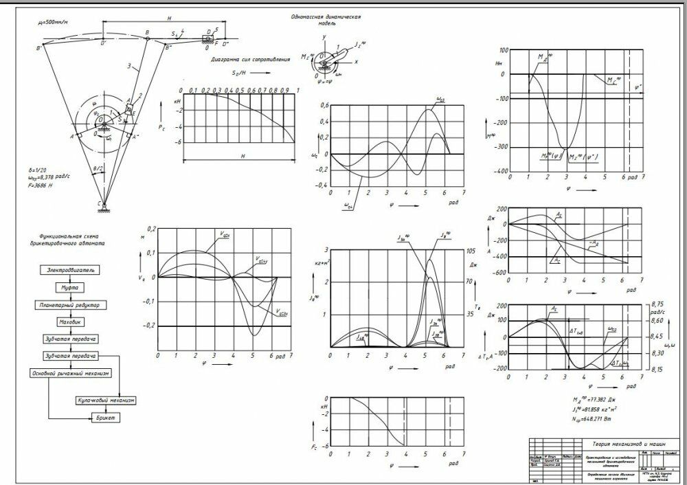 Расчетно-пояснительная записка к курсовому проекту «Проектирование и исследование механизмов упаковочного автомата»содержит 52 страницы машинописного текста, 25 рисунков, 8 таблиц. В расчетно-пояснительной записке приведено проектирование основного механизма упаковочного автомата, определение закона движения звена приведения, расчет дополнительной маховой массыс учетом заданного коэффициента неравномерности вращения кривошипа, кинетостатический силовой расчет основного механизма, проектирование цилиндрической эвольвентной зубчатой передачи, проектирование двухрядного планетарного редуктора, проектирование кулачкового механизма с силовым замыканием высшей пары.