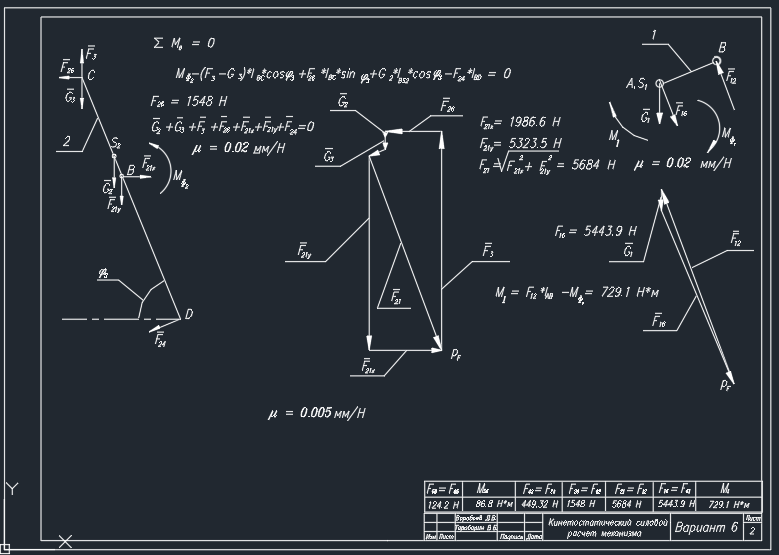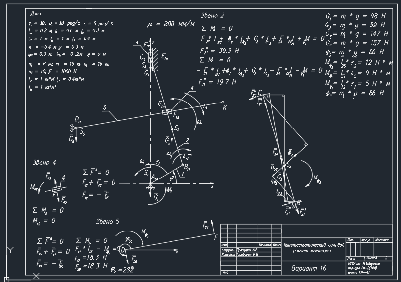Для студентов МГТУ им. Н.Э.Баумана по предмету Теория механизмов и машин (ТММ)Курсовой проект 6Д кинетический и силовой расчёт механизмаКурсовой проект 6Д кинетический и силовой расчёт механизма