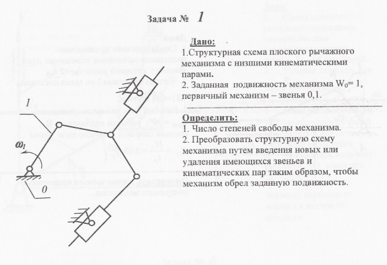 Дано; 1 .Структурная схема плоского рычажного механизма с низшими кинематическими парами. 2. Заданная подвижность механизма Wo— 1, первичный механизм — звенья О, 1, Определить: Число степеней свободы механизма. 2. Преобразовать структурную схему MexaHw3Ma путем введения новых или удаления имеющихся звеньев и кинематических пар таким образом, чтобы механизм обрел заданную подвижность..