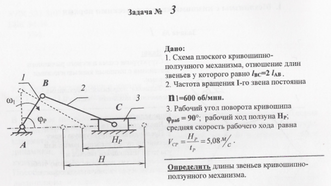Дано: 1. Схема плоского кривошипно- ползунного механизма, отношение длин звеньев у которого равно [вс=2 . 2. Частота вращения 1-го звена постоянна П 1=600 об/мин. 3. Рабочий угол поворота кривошипа = 900; рабочий ход ползуна Нр•, средняя скорость рабочего хода равна = 5,08У/ Определить длины звеньев кривошипно- ползунного механизма..