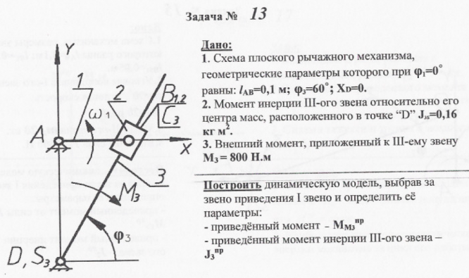 Дано: 1. Схема плоского рычажного механизма, геометрические параметры которого при равны: М; (Рз=60В; XIF(). 2. Момент инерции П!-ого звена относительно его центра масс, расположенного в точке “D” J3F0,16 кг м • З. Внешний момент, приложенный к 111-ему звену 800 н.м Построить динамическую модель, выбрав за звено приведения I звено и определить её параметры: - приведённый момент - Ммзпр - приведённый момент инерции П]-ого звена —.