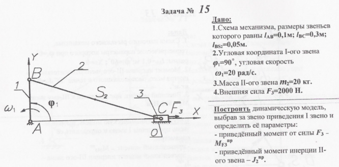 Дано: 1 „Схема механизма, размеры звеньев которого равны 2.Угловая координата 1-ого звена угловая скорость 01=20 рад/с. З.Масса И-ого звена пи=20 кг. 4.Внешняя сила Н. Построить динамическую модель, выбрав за звено приведения 1 звено и определить её параметры: - приведённый момент от силы F3 - - приведённый момент инерции 11- ОГО звена — Ј2ПР..