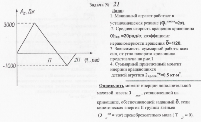 Д Дано: 1. Машинный агрегат работает в анкла— установившемся режиме (91 —21). 2. Средняя скорость вращения кривошипа О)1ср =20рад/с; коэффициент неравномерности вращения 6=1/20. З. Зависимость суммарной работы всех сил, от угла поворота кривошипа представлена на рис. 1. 4. Суммарный приведенный момент инерции вращающихся 2 ар=о.5 КГ•М . деталей агрегата ) в рдет- Определить момент инерции дополнительной маховой массы ) , установленной на кривошипе, обеспечивающей заданный б, если кинетическая энергия II группы звеньев ПР = var) пренебрежительно мала ( Т р.