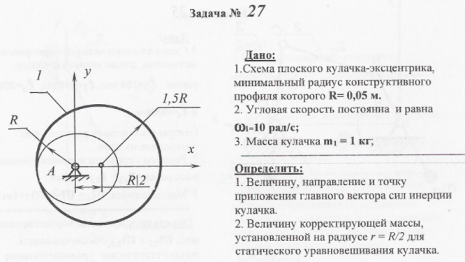 Дано: 1.Схема плоского кулачка-эксцентрика, минимальный радиус конструктивного профиля которого R= 0,05 м. 2. Угловая скорость постоянна и равна 01=10 рад/с; З. Масса кулачка nt1 = 1 кг; Определить: 1. Величину, направление и точку приложения главного вектора сил инерции кулачка. 2. Величину корректирующей массы, установленной на радиусе r = R/2 для статического уравновешивания кулачка..