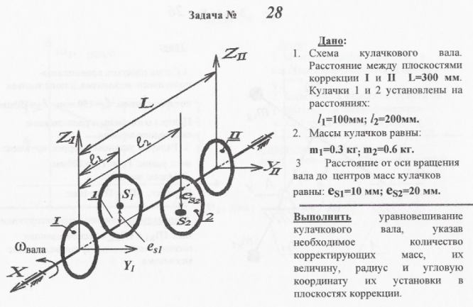 Дано: Схема кулачкового вала. Расстояние между плоскостями коррекции и II 13300 мм. Кулачки и 2 установлены на расстояниях: /т=100мм; [2=200мм. Массы кулачков равны: т 1=0.3 кг; пч=0.6 кг. Расстояние от оси вращения вала до центров масс кулачков равны: мм; еы=20 мм. Выполнить кулачкового необходимое уравновешивание вала, указав корректирующих величину, радиус количество масс, и угловую координату их установки в плоскостях коррекции..