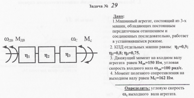 дано: 1.Машинный агрегат, состоящий из 3-х машин, обладающих постоянным передаточным отношением и соединенных последовательно, работает в установившемся режиме. 2. КПД отдельных машин равны: З. Движущий момент на входном валу агрегата равен Мдв=15О Нм, угловая скорость входного вала рад/с. 4. Момент полезного сопротивления на выходном валу равен Мс=162 Ни. Определить: угловую скорость Ос выходного вала агрегата..