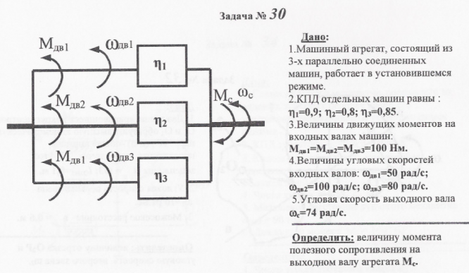 ано: 1 „Машинный агрегат, состоящий из 3-х параллельно соединенных машин, работает в установившемся режиме. 2.КПД отдельных машин равны Т) 1=0,9; З.Величины ДВИЖУЩИХ моментов на входных валах машин: нм. 4.Величины угловых скоростей входных валов: рад/с; рад/с; Одвз=80 рад/с. 5. Угловая скорость выходного вала 0674 рад/с. Определить: величину момента полезного сопротивления на выходном вму агрегата Мс..