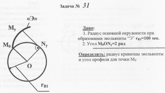 ано: 1. Радиус основной окружности при образовании эвольвенты “Э” гвт=10О мм. 2. Угол MoONy=2 рад. Определить: радиус кривизны эвольвенты и угол профиля для точки Му.